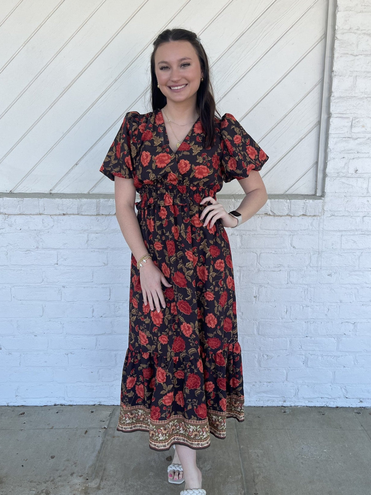Floral print short puff sleeve midi dress featuring V-neck, elasticated waist, snap button closure at bust, border print hem. Lined. Woven. Non-sheer. Lightweight.