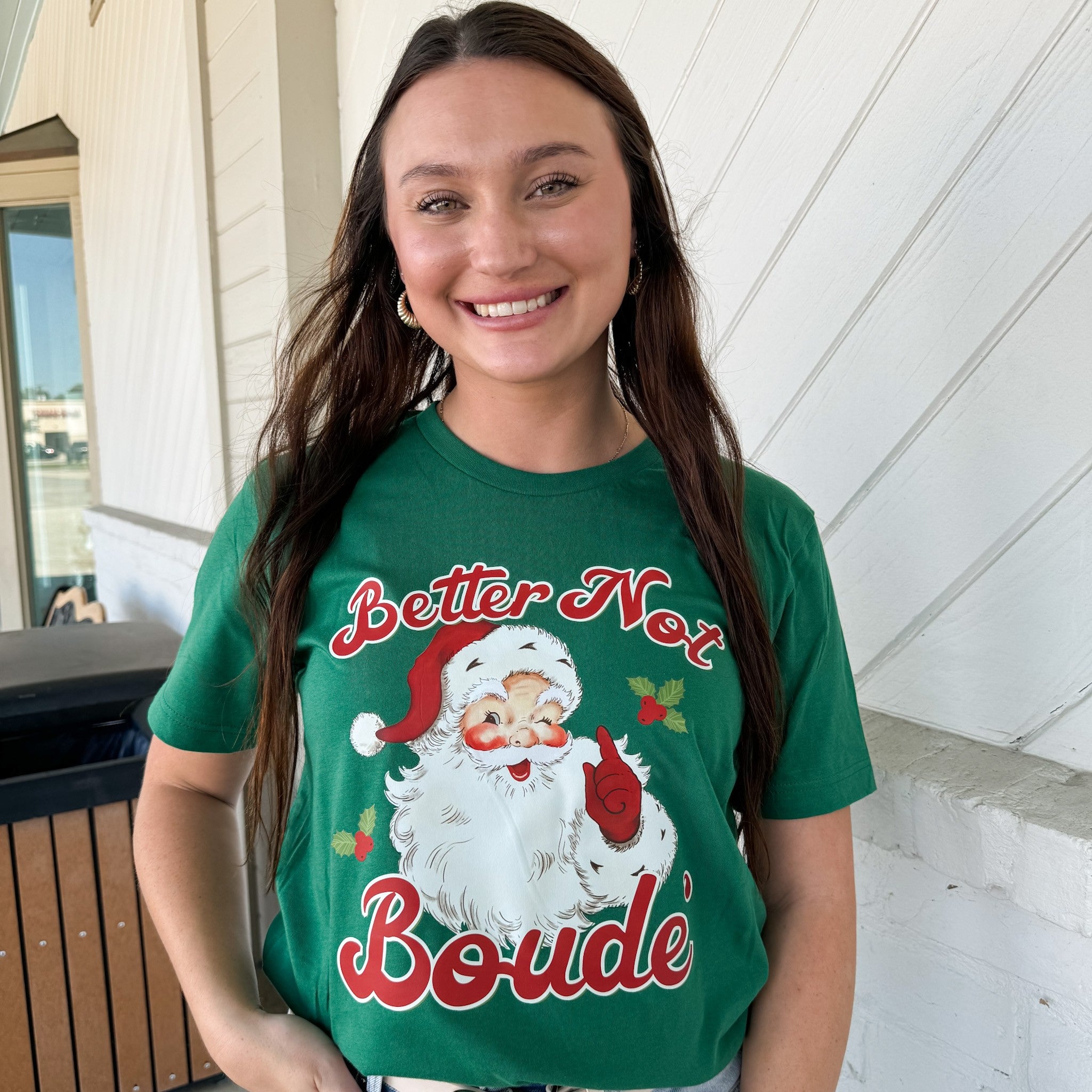 Better Not Boude! That is a Cajun spin on the saying "you better not pout".