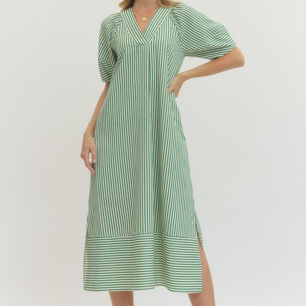 Stripe pattern textured pullover midi dress features raglan lantern sleeves and slit side hems. Pockets at side.
