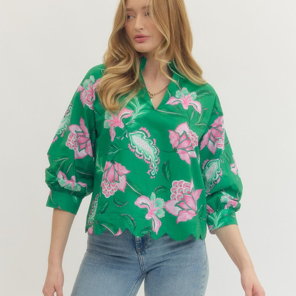 Floral print long sleeve top featuring scallop hem and V-neck band collar. Buttoned cuffs. Unlined. Woven. Non-sheer. Lightweight.