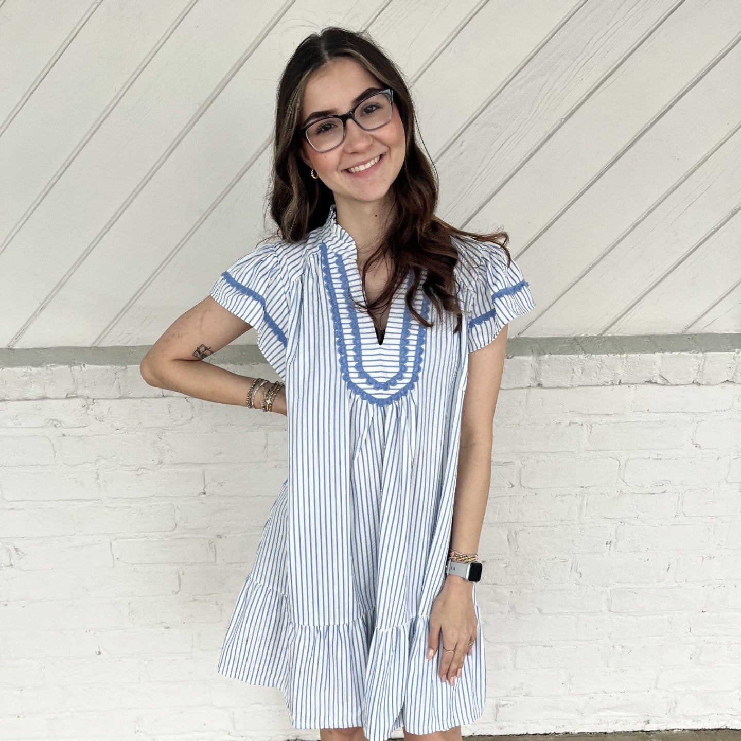 • Split V-neck with scalloped contrast trim