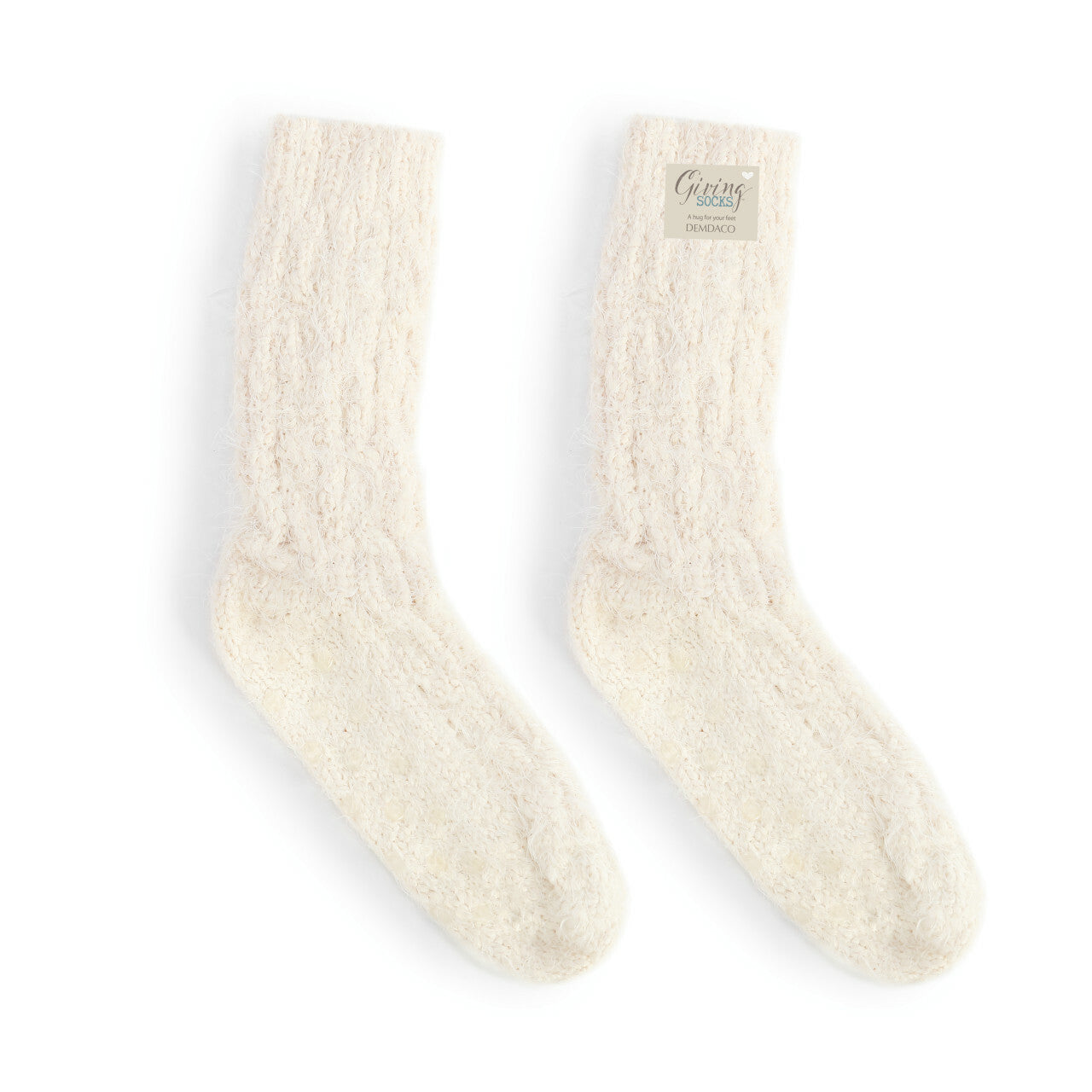 Super fuzzy and warm, these Women's Cream Fuzzy Giving Socks with Grippers are like a hug for your feet. Socks that are more like slippers, they are woven using a unique feather knit for superior coziness. DEMDACO's Fuzzy Giving Socks are warm and cozy indoor slippers you can wear around the house. Gift them to a wonderful wife, daughter, mother, or sister this season.