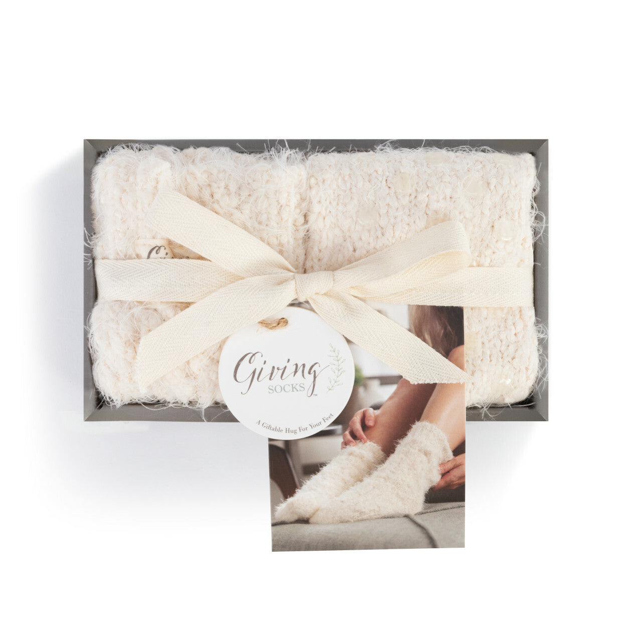 Our soft and cozy fabrics and weighted items are ideal for instantly making the day a little bit better. We all need a little comfort now and then... A reminder to help us know that we are not alone in the world... That someone is in our corner cheering us on not matter what. So we created the Giving Socks to be like a cozy, warm hug - any time it's needed. These socks have been knit together with love to remind you someone is always thinking of you with warm, fuzzy feelings, and a hug in their heart.