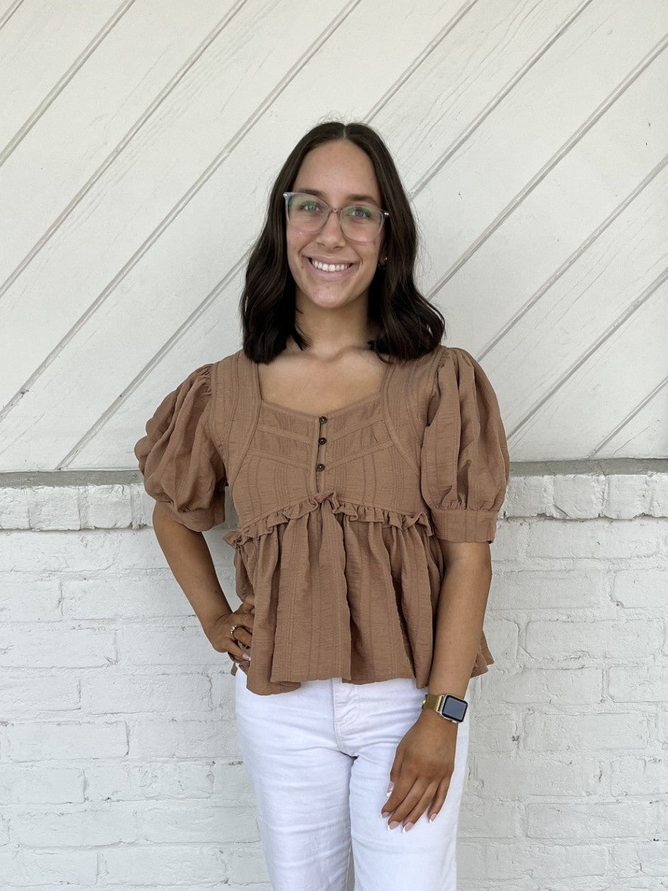 Textured puff sleeve peplum top featuring ruffle detail and button closure at bust. Unlined. Woven. Non-sheer. Lightweight.