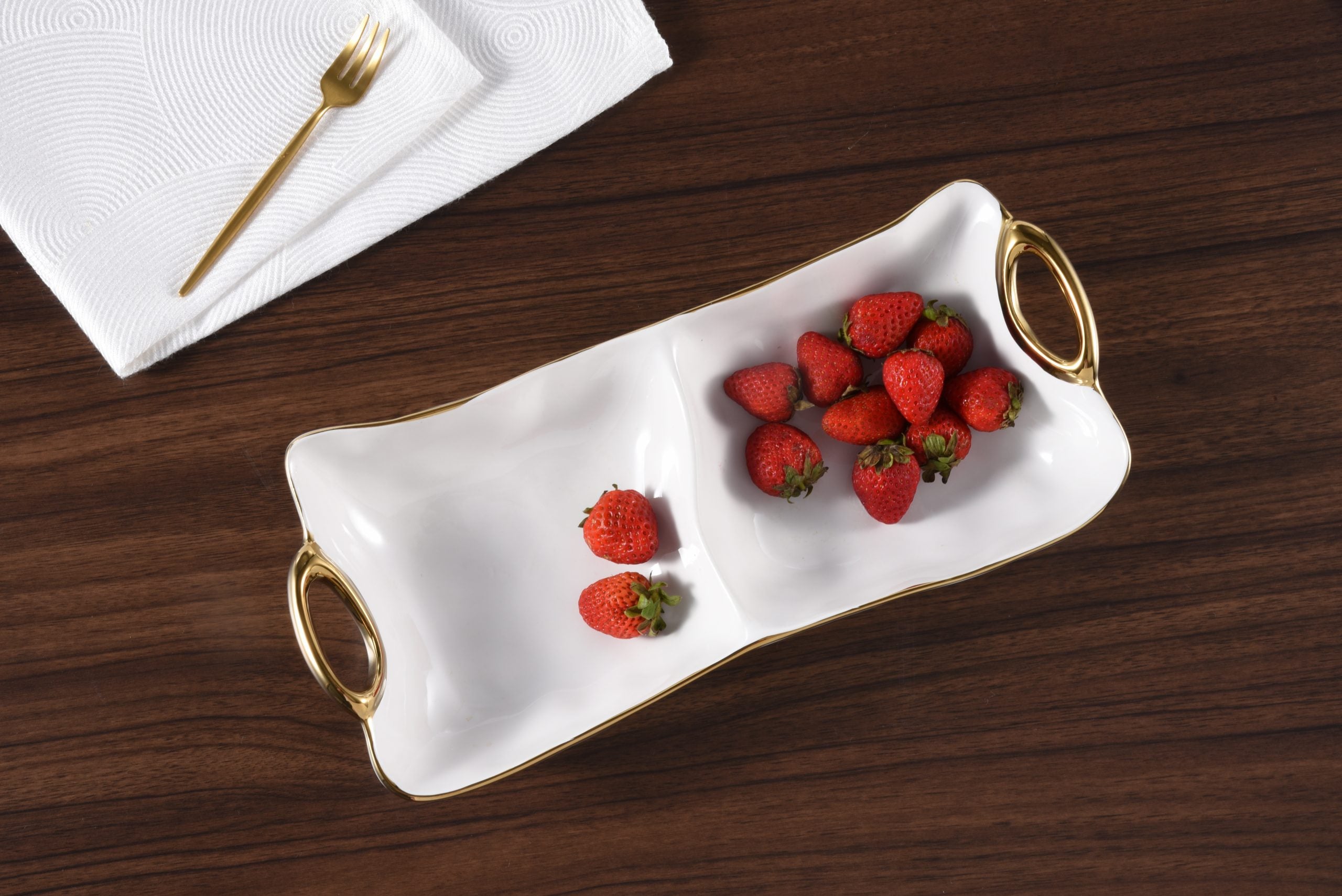 2 section server in golden handles. Great for serving your favorite pairs! Think chips and dip, hummus and veggies or apples and peanut butter. Stunning white porcelain with smooth and fluent handles in gold titanium. Food safe, dishwasher safe, oven safe to 500°. Easy care.